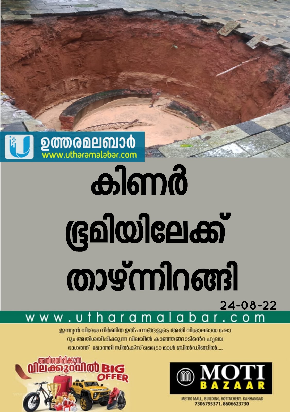 പിലിക്കോട്:കിണർ ആഴ്ന്നിറങ്ങി:പിലിക്കോട് ഗ്രാമപഞ്ചായത്ത് ഓഫീസിനു മുൻവശത്തുള്ള വി വി അഹമ്മദിന്റെ വീട്ടിലെ കിണറാണ് ഭൂമിയിലേക്ക് താഴ്ന്നിറങ്ങിയത്