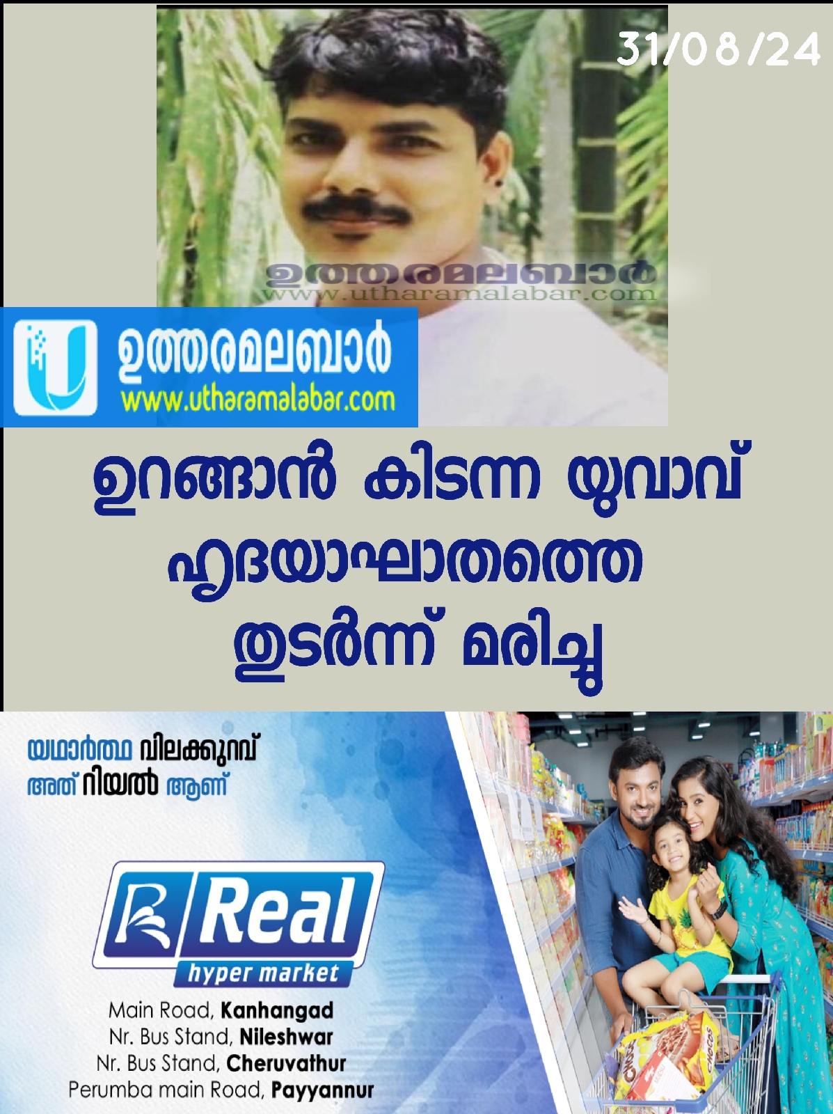 കാഞ്ഞങ്ങാട്: യുവാവ് ഹൃദയാഘാതത്തെ തുടർന്ന് മരിച്ചു.അട്ടേങ്ങാനം വെള്ളമുണ്ടയിലെ ദാമോദരന്റെയും രാധയുടെയും മകൻ സനേഷ് 30 ആണ് മരിച്ചത്.ഇന്നലെ രാത്രിയാണ് സംഭവം.ഉറങ്ങാൻ കിടന്ന ഉടൻ നെഞ്ചുവേദന അനുഭവപ്പെട്ടതിനെ തുടർന്ന് ശ്വാസതടസമുണ്ടായി ആശുപ
