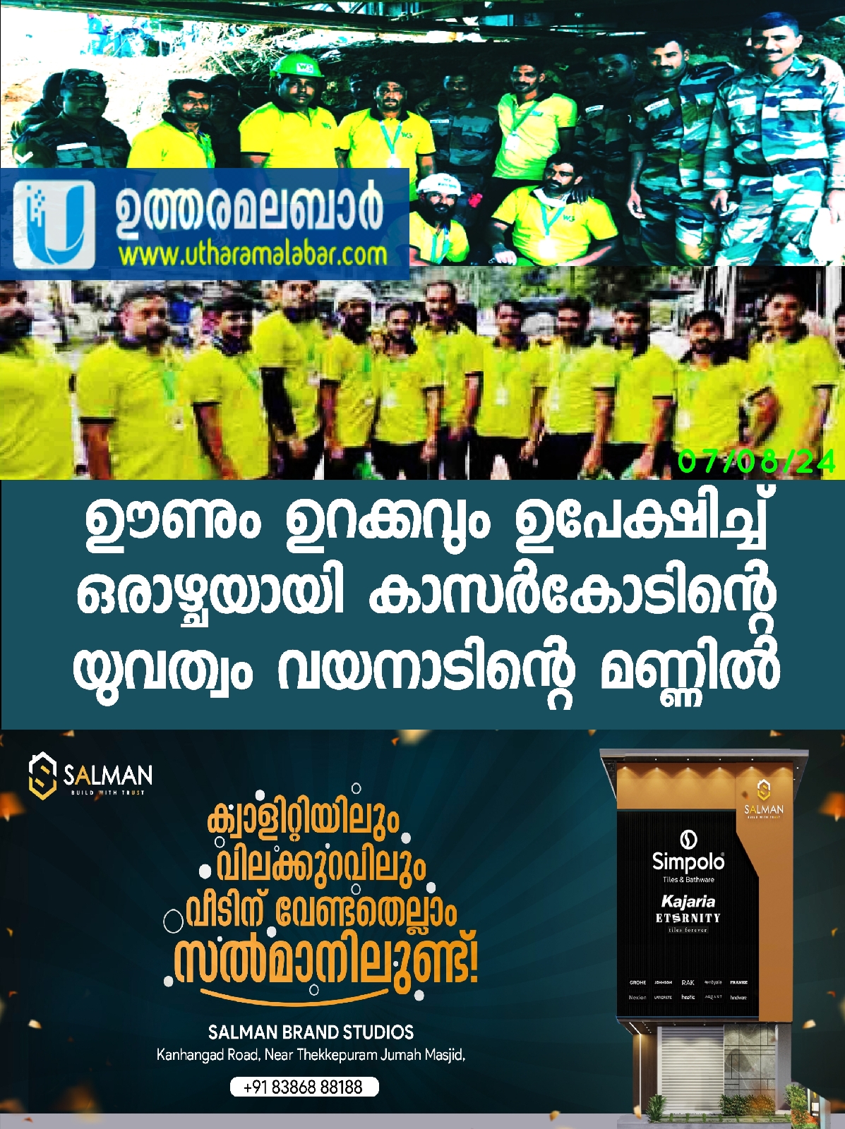 കാഞ്ഞങ്ങാട്: വയനാട്ടിലെ ഉരുൾപൊട്ടൽ ദുരന്തത്തിൽപെട്ടവർക്ക് സഹായവുമായി കാസർകോട് ജില്ലയിൽ നിന്നു മുള്ള യുവാക്കളും . ദുരന്തവിവരമറിഞ്ഞ ഉടനെ ജില്ലയിൽ നിന്നും പാഞ്ഞെത്തിയ വരാണ് യുവാക്കൾ. മണ്ണിലകപ്പെട്ടവരെ തിരയുന്നസൈനികർ ഉൾപ്പെടെയുള്ള രക്ഷാപ്രവർത്തകരെ സഹായിച്ച് സന്നദ്ധ പ്രവർത്തകർ ദുരന്ത ഭൂമിയിലെ സജീവ സാന്നിധ്യമാണ്. ജില്ലയിൽ നിന്നുള്ള നൂറോളം പ്രവർത്തകരാണ് ഊണു മുറക്കവുമുപേക്ഷിച്ച് സേവന പ്രവർത്തനങ്ങളിൽ മുഴുകിയിരിക്കുന്നത്. കാഞ്ഞങ്ങാട്, ആറങ്ങാടി, പള്ളിക്കര, ചെർക്കള, മഞ്ചേശ്വരം, മാങ്ങാട്,ചെർക്കള,ഉദുമ ചട്ടഞ്ചാൽ, അജാനൂർ കൊളവയൽ തുടങ്ങി ജില്ലയിലെ വിവിധ പ്രദേശങ്ങളിൽ നിന്നുള്ള യുവാക്കളാണ് സൈനികരെയും അഗ്നിരക്ഷാ സേനാംഗങ്ങളെയും സഹായിക്കാൻ വയനാട്ടിൽ പ്രവർത്തിക്കുന്നത്.ദുരന്തം നടന്നതിന്റെ പിറ്റേദിവസം തന്നെ ഇവർ വയനാട്ടിലെത്തിയിരുന്നു.ജില്ലയിൽ നിരവധി കാരുണ്യ രക്ഷാപ്രവർത്തനങ്ങൾ നടത്തിയ യുവാക്കളാണ് ഇവർ.ജില്ലയിൽ തന്നെ പല ദുരന്തമുഖങ്ങളിലും രക്ഷകരായ എത്തുന്ന വിവിധ സംഘടനകളുടെ പ്രതിനിധികളാണ് ഒരാഴ്ചയായി വയനാട്ടിലുള്ളത്. മണ്ണിനടിയിൽ കുടുങ്ങി കിടന്ന വരുടെ മൃതദേഹങ്ങൾ ഉൾപ്പെടെ തങ്ങളുടെ പ്രയത്നം മൂലം കണ്ടെത്താനായെന്ന് ഇവർ പറഞ്ഞു. മണ്ണിനടിയിൽ നിന്നും ലഭിച്ച സ്വർണാഭരണങ്ങളും പണങ്ങളും കണ്ടെത്തി പൊലീസിന് കൈമാറാനായി. പ്രവർത്തനത്തിൻ്റെ അവസാനം വരെ ദുരന്ത ഭൂമിയിൽ പ്രവർത്തിക്കാനാണ് ഇവരുടെ തീരുമാനം.