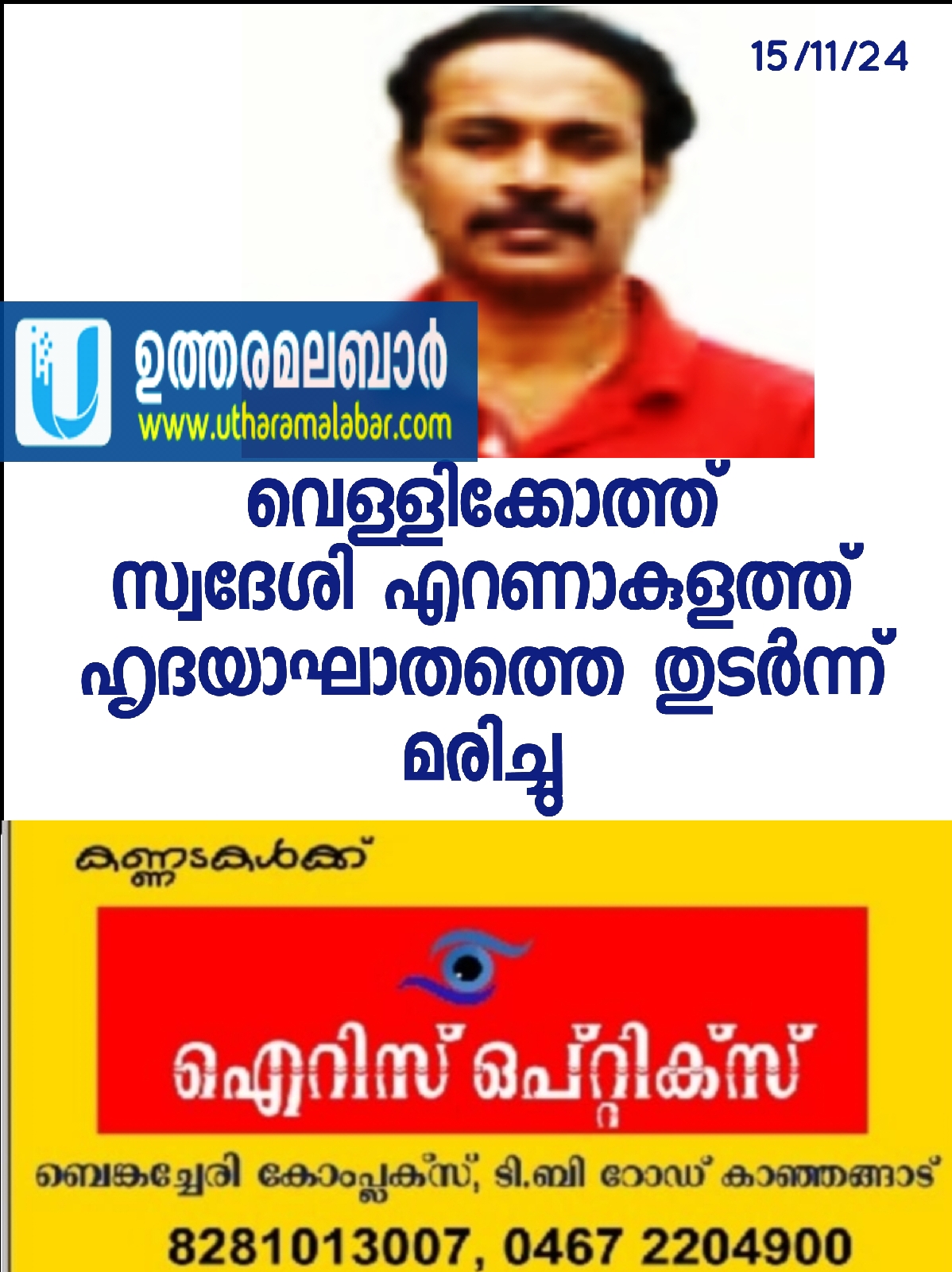 കാഞ്ഞങ്ങാട്: വെള്ളിക്കോത്ത് കണ്ണികുളങ്ങര റോഡിലെ സി. മധു 50 ഹൃദയാഘാതത്തെ തുടർന്ന് എറണാകുളത്ത് മരിച്ചു.