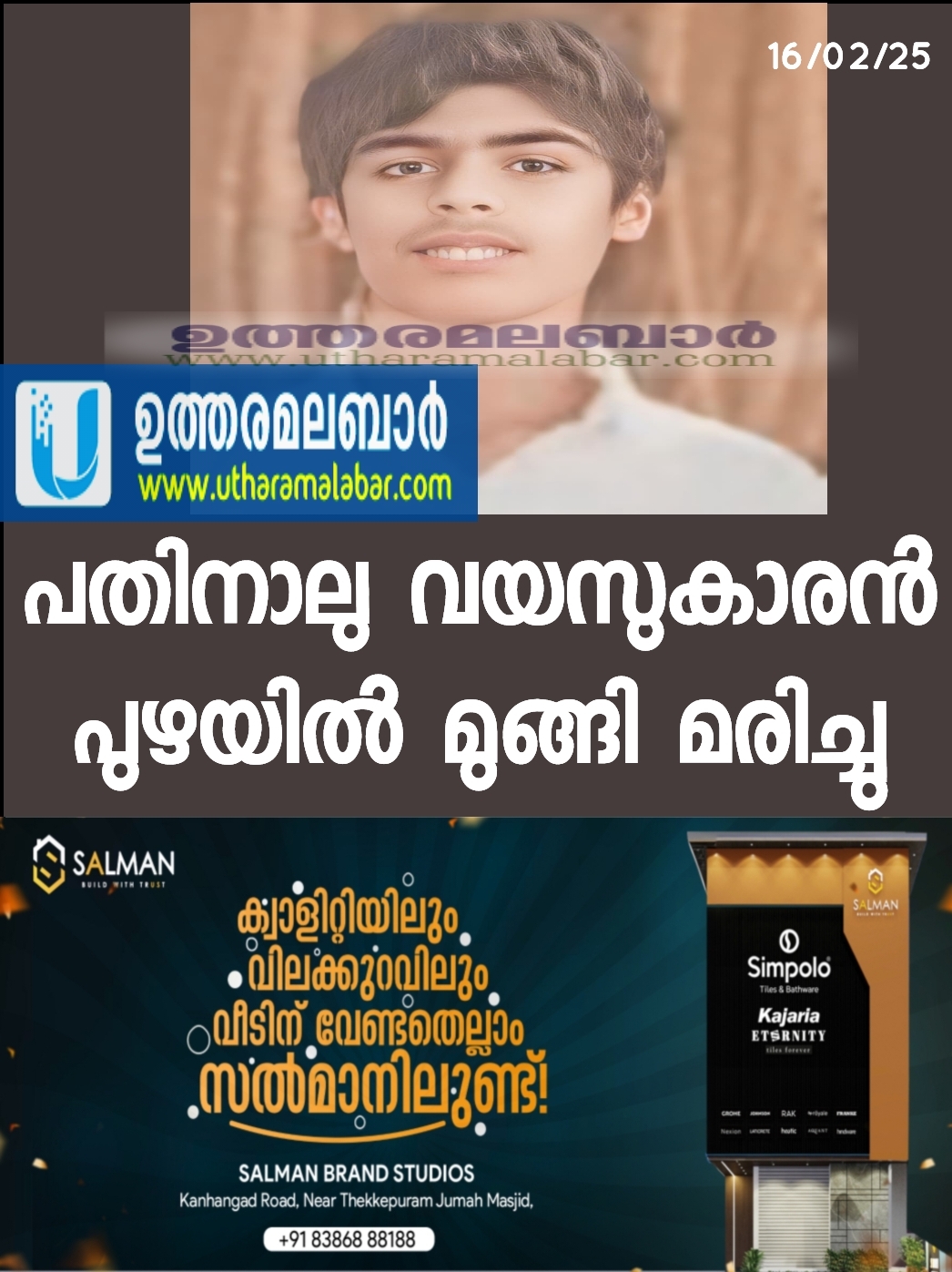 കാഞ്ഞങ്ങാട് :പതിനാലു വയസുകാരൻ പുഴയിൽ മുങ്ങി മരിച്ചു. ഉദുമ മാങ്ങാട്ടെ വെടിക്കുന്നിൽ അബ്ദുൾ സത്താറിൻ്റെ മകൻ അബ്ദുള്ള ആണ് മരിച്ചത്. ഇന്ന് വൈകീട്ട് 6.15 ന് ആണ് അപകടം. പടിഞ്ഞാറിലെ ബന്ധു