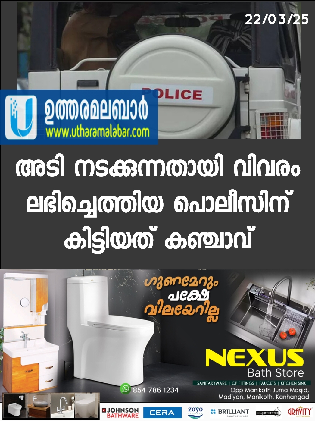 കാഞ്ഞങ്ങാട് :അടി നടക്കുന്നതായി വിവരം ലഭിച്ചെത്തിയ പൊലീസിന് കിട്ടിയത് മുക്കാൽ കിലോയോളം കഞ്ചാവ് . മടക്കര പാലത്തിനടുത്ത് അടി നടക്കുന്നതായി വിവരം ലഭിച്ചെത്തിച ന്തേര എസ്.ഐ കെ പി . സതീഷുംപാർട്ടിയുമാണ് കഞ്ചാവ് പിടികടിയത്. രാത്രി 9.30 മണിക്ക് ഇതര സംസ്ഥാനക്കാർ അടി നടത്തുന്നതായ റിഞ്ഞാണ് പൊലീസെത്തിയത്. പൊലീസിനെ കണ്ട ഉടൻ ഒരു യുവാവ് ഓടി. പിന്തുടർന്ന് ബലപ്രയോഗത്തിലൂടെ കീഴ്പെടുത്തിയപ്പോഴാണ് കവറിൽ കരുതിയ 700 ഗ്രാം കഞ്ചാവ് പൊതികളാക്കി സൂക്ഷിച്ച നിലയിൽ കണ്ടത്. ചില്ലറ വിൽപ്പനക്ക് സൂക്ഷിച്ചതായിരുന്നു കഞ്ചാവ് . ഒറീസ കേന്ദ്രപ്പാറയിലെ പത്മ ലോചൻഗിരി 42 ആണ് കഞ്ചാവുമായി പിടിയിലായത്.