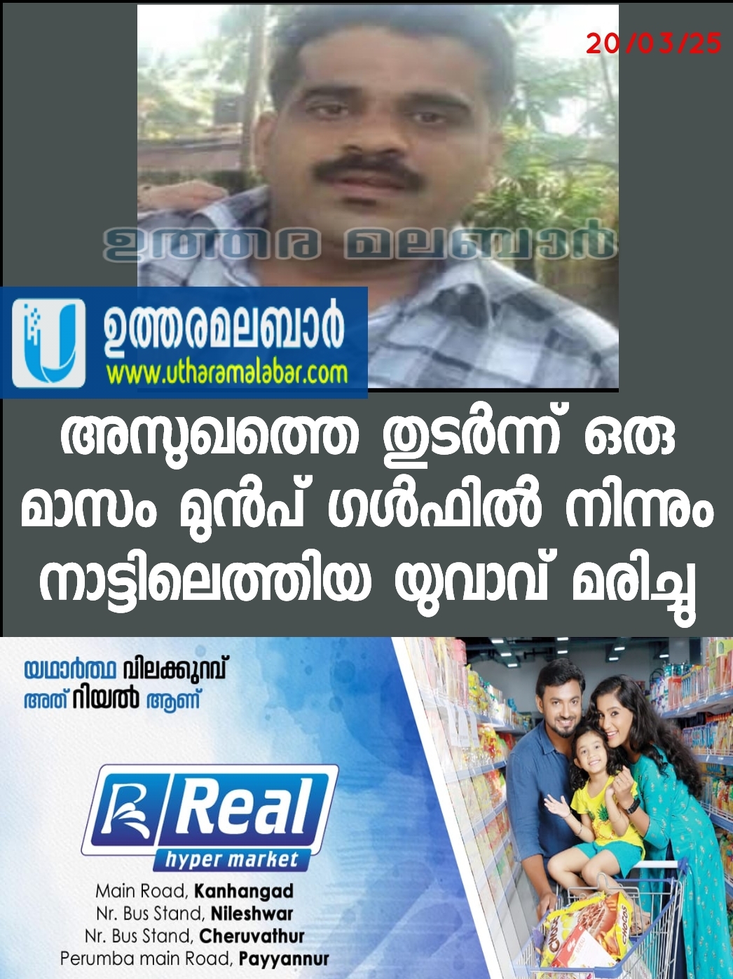 കാഞ്ഞങ്ങാട് : ഒരു മാസം മുൻപ് ഗൾഫിൽ നിന്നും നാട്ടിലെത്തിയ യുവാവ് മരിച്ചു. കാഞ്ഞങ്ങാട് ബല്ലാ കടപ്പുറം സ്വദേശി മഹമൂദ് 46 ആണ് മരിച്ചത്. അസുഖത്തെ തുടർന്ന് ഒരു മാസം മുൻപാണ് ഗൾഫിൽ നിന്നും നാട്ടിലെത്തിയത്. സ്ട്രോക്ക് വന്ന് എട്ട് മാസത്തോളമായി അബുദാബി ആശുപത്രിയിൽ ചികിൽസയിലായിരുന്നു. അസുഖം കൂടുതലായതിനാൽ വിദഗ്ധ ചികിൽസക്ക് അബുദാബിയിൽ നിന്നും നാട്ടിലേക്ക് മടങ്ങുകയായിരുന്നു. കണ്ണൂർ ആശുപത്രിയിലാണ് മരണം. പിതാവ്: എം പി . കുഞ്ഞഹമ്മദ്. മാതാവ്: ഫാത്തിമ. ഭാര്യ: റഷീദ കല്ലൂരാവി. മക്കൾ: നുഹൈമ