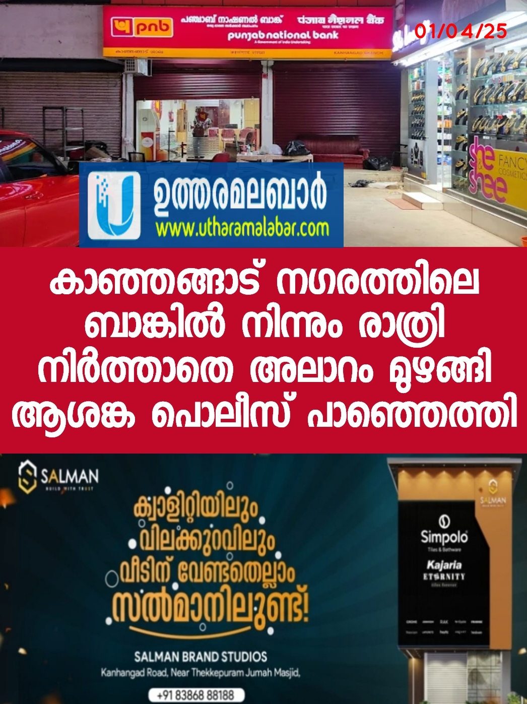 കാഞ്ഞങ്ങാട് :കാഞ്ഞങ്ങാട് നഗരത്തിലെ ബാങ്കിൽ നിന്നും രാത്രി നിർത്താതെ അലാറം മുഴങ്ങിയത് ആശങ്കക്കിടയാക്കി. വിവരമറി ഞ്ഞ്പൊലീസ് ബാങ്ക് പരിസരത്തേക്ക് പാഞ്ഞെത്തി. ബസ് സ്റ്റാൻ്റിനടുത്തുള്ള ഷോപ്പിംഗ് കോംപ്ലക്സിൽ പ്രവർത്തിക്കുന്ന പഞ്ചാബ് നാഷണൽ ബാങ്കിൽ നിന്നുമാണ് ഇന്നലെ രാത്രി നിർത്താതെ അപായ ശബ്ദം മുഴങ്ങിയത്. രാത്രി തന്നെ പൊലീസ് എത്തിപരിശോധിച്ച് മറ്റ് പ്രശ്നമൊന്നുമില്ലെന്ന് ഉറപ്പ് വരുത്തി. രാത്രി മുഴുവൻ അലാറം മുഴങ്ങിയിരുന്നു. ഇന്ന് രാവിലെയാണ് തകരാറ് പരിഹരിക്കാനായത്. സാങ്കേതികതകരാറാണെന്ന് ബ്രാഞ്ച് മാനേജർ ഉത്തര മലബാറിനോട് പറഞ്ഞു. സാങ്കേതിക പ്രശ്നമുണ്ടായിരുന്നതിനാൽ ഇന്നലെ പകൽ ടെക്നീഷ്യനെത്തി തകരാറ് പരിഹരിച്ചിരുന്നു. പിന്നാലെയാണ് വീണ്ടും തകരാറിലായി രാത്രിയിൽ മുഴുവൻ അലാറം മുഴങ്ങിയത്.